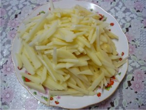 Картофель сырой очищаем, нарезаем мелко соломкой.