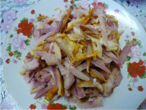Яйца варим, очищаем, отделяем белки от желтков. Белки нарезаем соломкой.