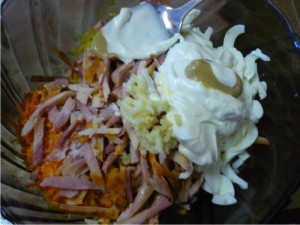 Заправляем все майонезом, добавляем чеснок по вкусу и горчицу готовую.