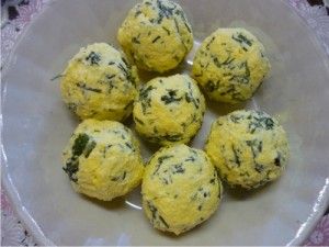 Желтки растираем с майонезом, добавляем мелконарезанный укроп, формируем шарики