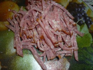Колбасу режем тонко соломкой.