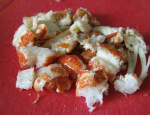 Сверху на мякоть апельсина выложим мясо рака и, предварительно порезанное на маленькие кусочки, яблоко.