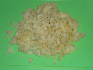 Картофель отварить, остудить, очистить, нарезать кубиком.