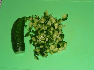 Огурцы нарезать также кубиком, по желанию очистив их от кожицы.