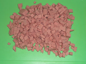 Колбасу вареную и копченую нарезать кубиком. Лучше всего добавлять не один вид колбасы, тогда вкус блюда будет более выраженным.