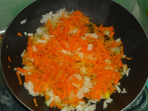 Лук режем мелким кубиком, а морковь трем на терке. Зажариваем в небольшом количестве масла на сковороде.