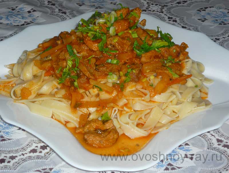 Теперь можно добавить томатную пасту. Обжариваем все вместе и заливаем овощи и мясо отваром от лапши. Саму лапшу при необходимости промываем, немного сдабриваем подсолнечным маслом, чтобы она не слиплась. Доводим наш лагманный соус до кипения и варим на медленном огне минут 30- 40. В конце солим и перчим по вкусу. Можно добавить зелень.