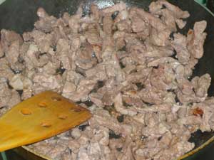 Мясо нарезаем брусочками, выкладываем на сковороду с небольшим количеством подсолнечного масла. Обжариваем немного.