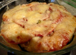 Теперь берем помидоры, нарезаем их как кабачки с картошкой, солим немного, перчим и выливаем на них оставшуюся заливку. Потом возьмем сыр моцарелла и, отламывая маленькие кусочки руками, выкладываем равномерно его на наши овощи с куриным филе.