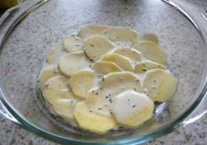 Далее отвариваем картошку, но варим ее не до конца, чтобы она получилась с сырцом ( то есть в серединке оставалась сыроватой). Я, например, варю ее в микроволновке, так будет намного быстрее и легче. Потом очищаем ее от кожуры и нарезаем не толстыми кружочками, примерно пол сантиметра каждый пласт. Теперь берем форму, в которой будем готовить наше блюдо, смазываем ее маслом и начинаем выкладывать все слоями. Сначала укладываем картошку и немного польем ее заливкой.