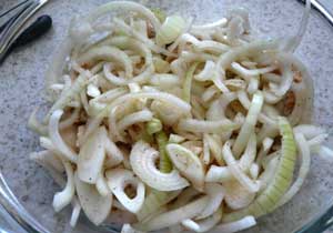 Далее нарезаем полукольцами лук, солим его, перчим немного и добавляем несколько капель яблочного уксуса. Теперь помнем лук руками и оставим в сторонке на некоторое время, чтобы он за мариновался.