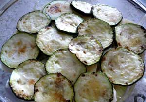 Далее возьмем кабачок, помоем его хорошо и нарежем средними кружочками, таким же размером, как нарезали картошку. Обжарим на масле, которое осталось после куриного филе и выкладываем поверх курочки.