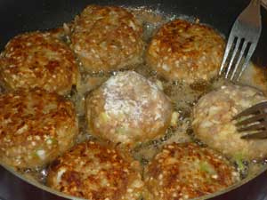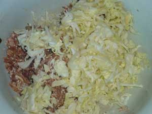 Капусту моем, нарезаем короткой соломкой. Мясо перекручиваем на мясорубке, солим, перчим, добавляем мелконарезанный репчатый лук (половину от нормы, указанной в ингредиентах).