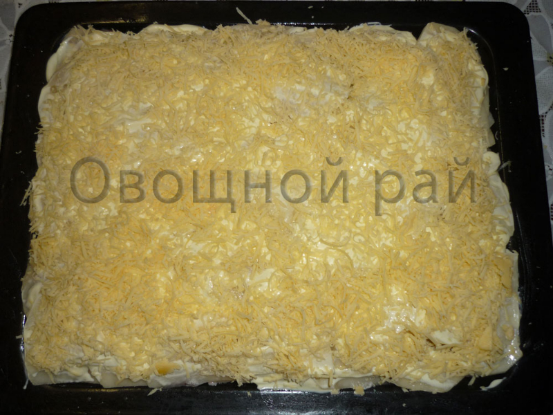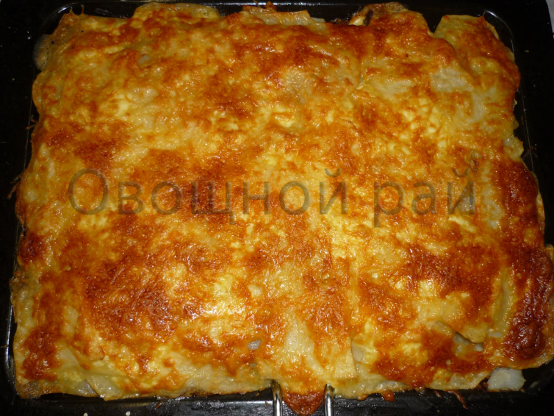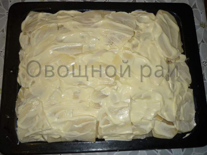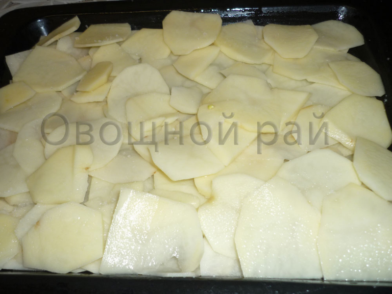 Нарезать тонкими ломтиками и выложить слоем на смазанный подсолнечным маслом противень. Выложить половину картофеля. Посолить.