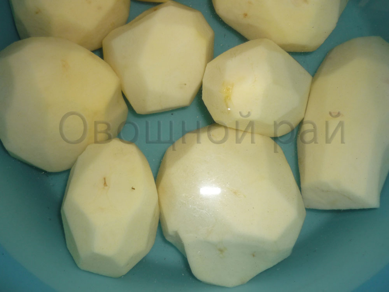 Подготовленный картофель (очищенный и промытый). точно так же, как и в этом рецепте приготовления минтая с картошкой.