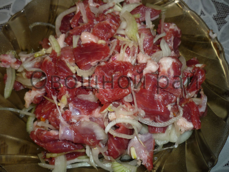 Мясо нарезаем тонкими ломтиками. Желательно резать замороженным или слегка подтаявшим. Ломтики получатся ровными и тонкими. Лук нарезаем полукольцами, чеснок выдавливаем через чеснокодавку. Смешиваем мясо с луком, чесноком, солим и перчим.