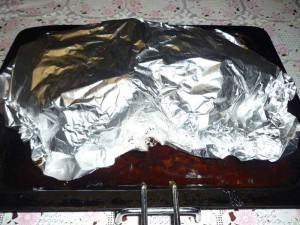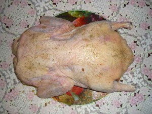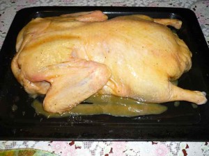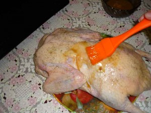 Смазываем обильно тушку этой смесью, внутри промазывая тоже. Делаем это кисточкой.
