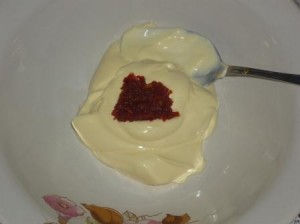 Стейки промыть, обсушить полотенцем, посолить немного. Майонез смешиваем с ложкой аджики ( можете использовать и домашнюю жгучую приправу),