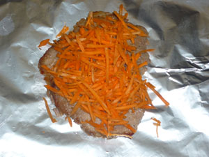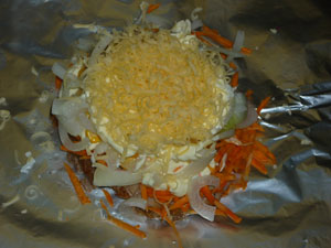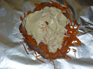 Каждый слой промазываем майонезом. Сверху натертый сыр.