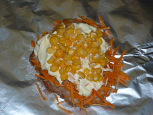 затем кладем кукурузу, опять майонез, затем кладем лук.