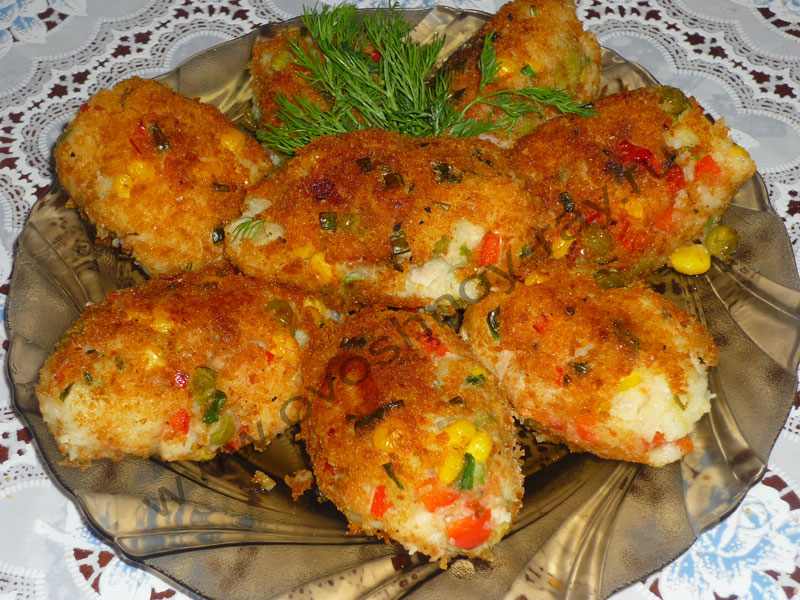 Все перемешиваем, формуем картофельные котлеты. Обваливаем их в панировочных сухарях и обжариваем на сковороде.