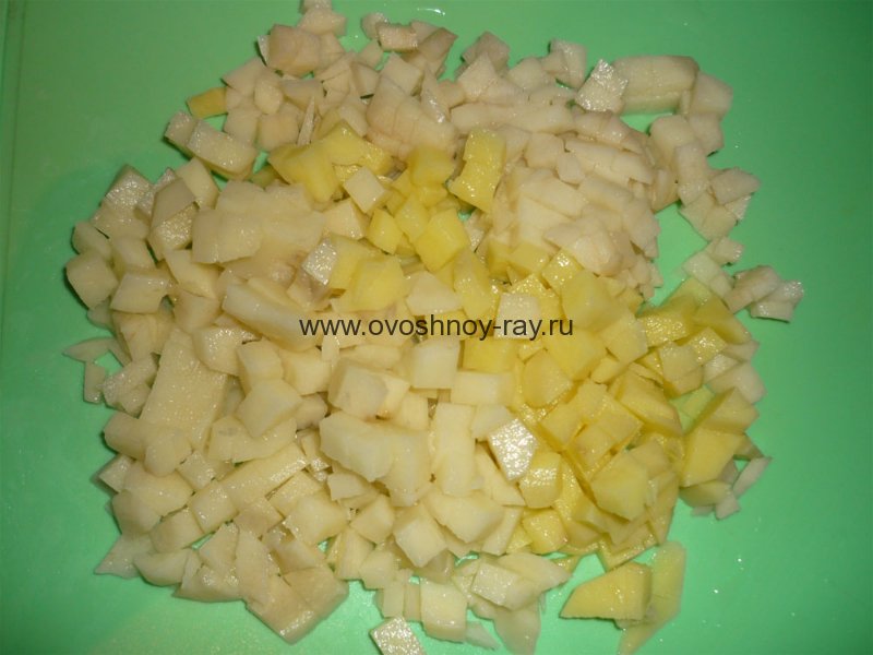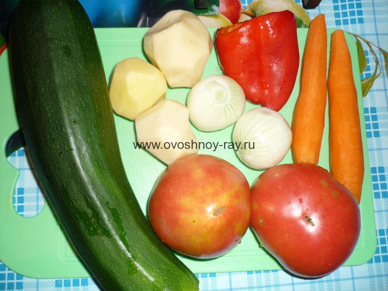 Кабачок, картофель, морковь, лук, перец болгарский, помидор нарезать кубиками.