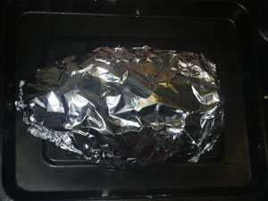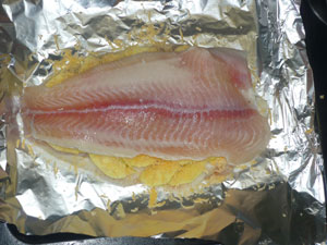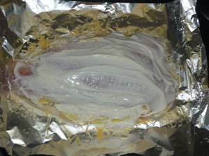 На фольгу кладем ложку сметаны, распределяем по размеру филе.