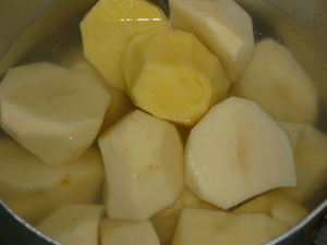 Для начала займемся начинкой. Картофель очищаем, заливаем кипятком, солим, варим 20 минут.