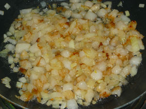 Лук режем кубиком. Дожидаемся, пока сало немного вытопится и всыпаем к нему лук. Жарим все на среднем огне. Вытапливается немного жира, но это и хорошо. Он придаст начинке сочность.