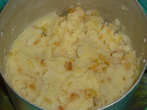 Поджаренное сало с луком соединяем с картофелем, который еще должен быть горячим и толчем все вместе.