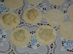 Начинка уже остыла и можно лепить вареники с салом и картошкой. Раскатываем тесто в тонкий пласт и выдавливаем стаканом кружочки.На середину каждого кружочка кладем начинку.