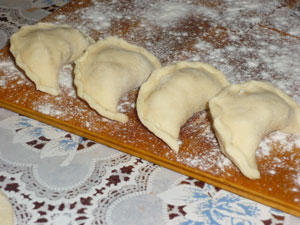 Защипываем края и кладем вареники на подпыленную мукой поверхность.