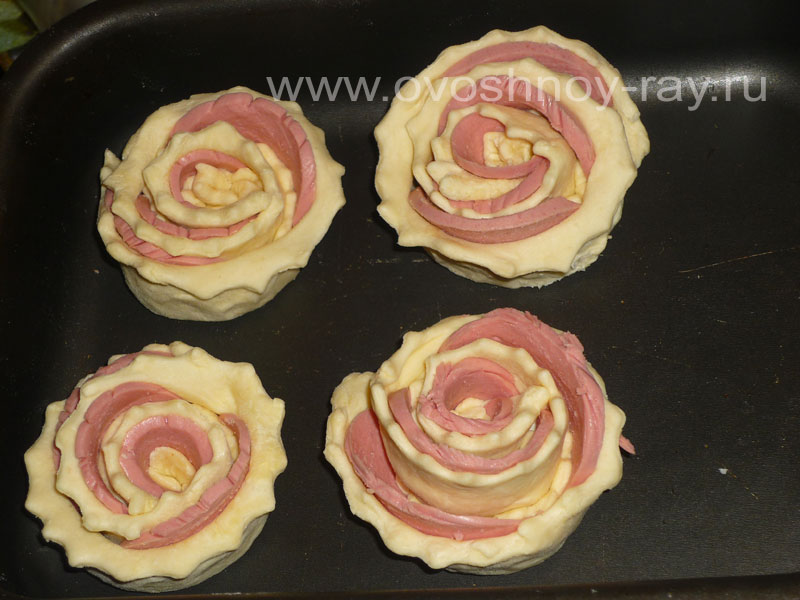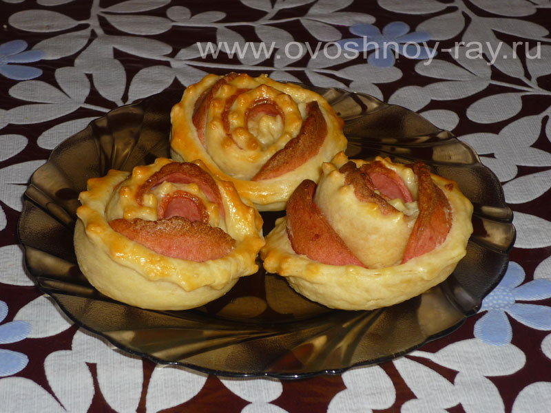 Отличные розочки с колбасы. Я делала такие розочки без начинки,только посыпая сахаром,тоже вкусно, а с начинкой. да еще с колбасной,вдвойне вкуснее.