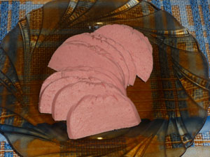 Колбасу разрежем вдоль и шинкуем ломтиками, толщина которых 3 мм. Надо резать тонко, чтобы розочка получилась изящнее.