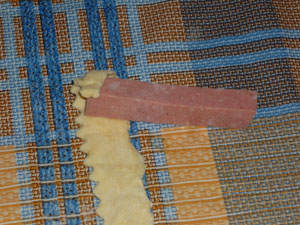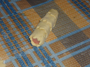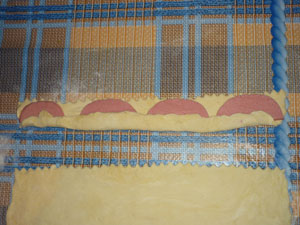Ширина полосок теста около 2 см. Колбасу или сосиску кладем на край ленты из теста и прокатывающим движением обворачиваем колбаску тестом.