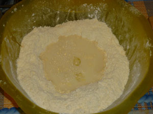 Перетираем руками маргарин комнатной температуры с мукой. В воду добавляем яйцо, перемешиваем, добавляем также в нее соль, уксус и водку.