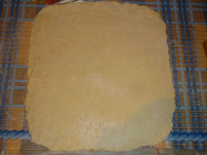 Раскатываем первый кусок теста в пласт прямоугольной или квадратной формы так, чтобы одна сторона была по длине не менее 25- 30 см.