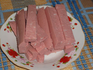В роли начинки выступит, собственно, сама колбаса- вареная любая, или сосиски- 400 граммов.