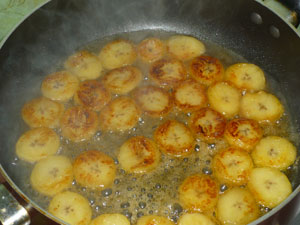 Бананы нарезаем на кружки потолще-0,5 см. в сковороде растапливаем сливочное масло. Выкладываем туда кружки банана. Банан для оформления верхушки используем недозрелый.