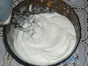 Белок, обязательно охлажденный, взбиваем, добавляя понемногу сахар. Почти в самом конце добавляем уксусную эссенцию. Готовность крема Вы поймете по глянцевому блеску и как буд- то пластмассовой поверхности.