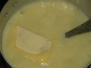 Вливаем желтковую массу в кипящее молоко, постоянно помешивая. Доводим крем до кипения. Он начнет постепенно густеть. Кипятить его не нужно. Помните, что такой крем довольно быстро подгорает ко дну, поэтому постоянно мешаем массу. Снимаем крем с огня и добавляем сливочное масло.