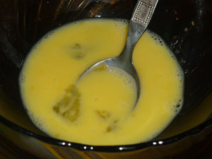 Яйцо взбить немного вилкой, добавляем воду и водку.