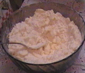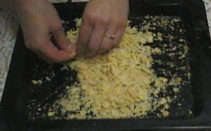 Охлажденный маргарин порубить с просеянной мукой до мелких комочков.