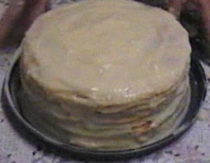 Итак, все коржи испечены, крошка готова (обрезки перетираем между ладонями для этого), крем остыл. Пора формировать торт. Можно поместить коржи в форму для торта и там хорошо пропитать их некоторое время, прежде чем посыпать торт крошкой. Но если у Вас нет этой формы, кладите коржики на круглую разделочную доску или на блюдо. Промазываем торт кремом.