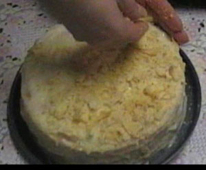 Последний слой завершает крем и, поверх всего и с боков, обсыпаем крошкой.