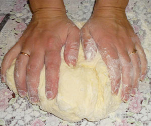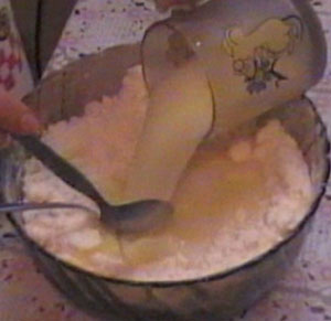 Теперь надо влить 50 мл холодного молока, перемешиваем, добавляем всю муку. Вливаем еще 50 мл молока.