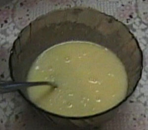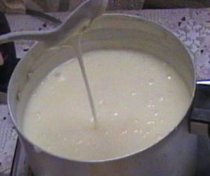 То молоко, что осталось теперь кипятим. Горячее вливаем тонкой струйкой в желтки с мукой и сахаром, постоянно помешивая.