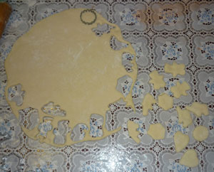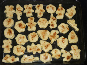 Оставшиеся обрезки опять соединяем вместе, немного подмешиваем тесто. Раскатываем и снова выдавливаем фигурки.