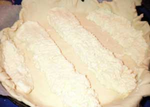 Сверху выкладываем начинку из творога, выкладываем ее рядами, чтобы оставалось место для клубничной начинки.