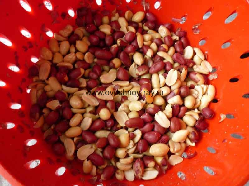 Орехи пропустить через мясорубку, но мне больше нравится, если орехи (в моем случае, земляные) будут цельные, очищенные с помощью дуршлага как показано на фотографии. Растирая их между пальцами, добиваемся того, что лишняя шелуха с них будет отсеиваться.